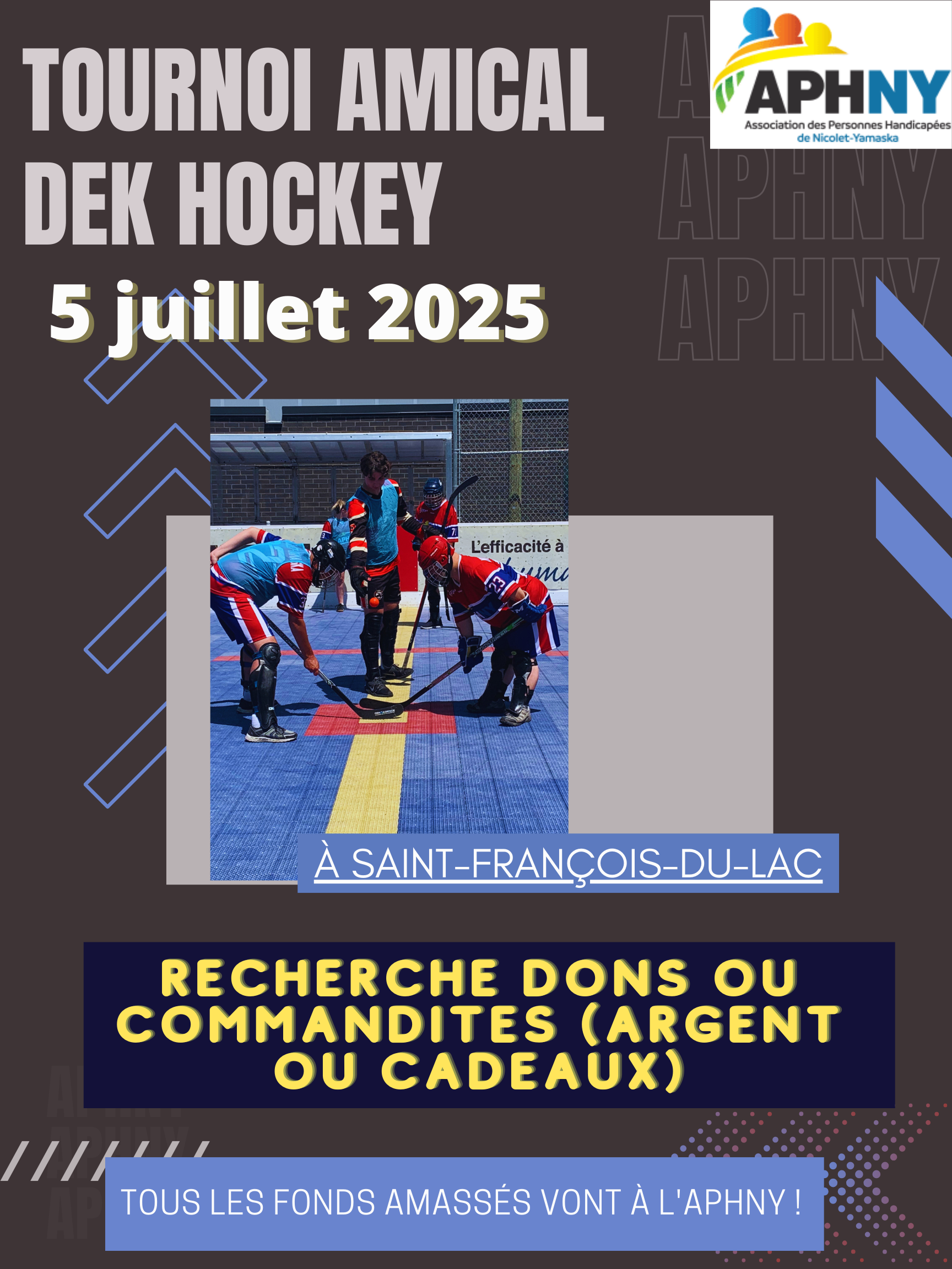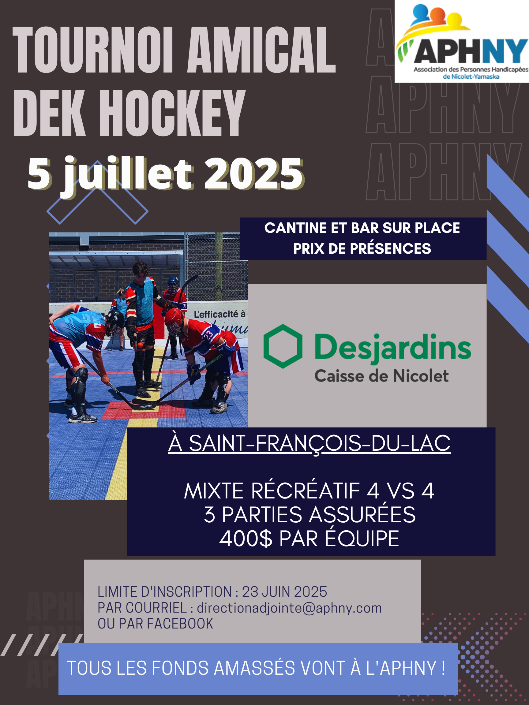 L'Association des personnes handicapées de Nicolet-Yamaska (APHNY) tiendra sa 5ᵉ édition de son tournoi amical de Dek hockey, le samedi 5 juillet 2025, à la surface de Saint-François-du-Lac.
