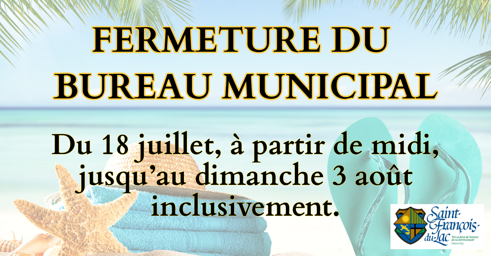 Veuillez prendre note que le bureau municipal sera fermé du 18 juillet, à partir de midi, jusqu'au 3 août inclusivement.