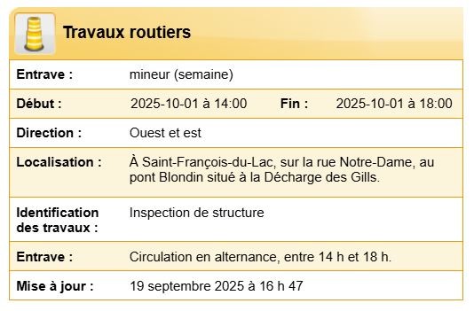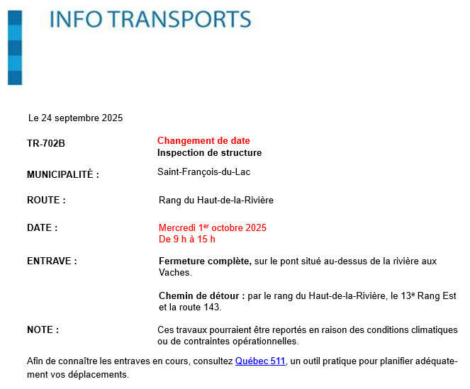 Ces travaux pourraient être reportés en raison des conditions climatiques ou de contraintes opérationnelles. Afin de connaître les entraves en cours, consultez Québec 511, un outil pratique pour planifier adéquatement vos déplacements.