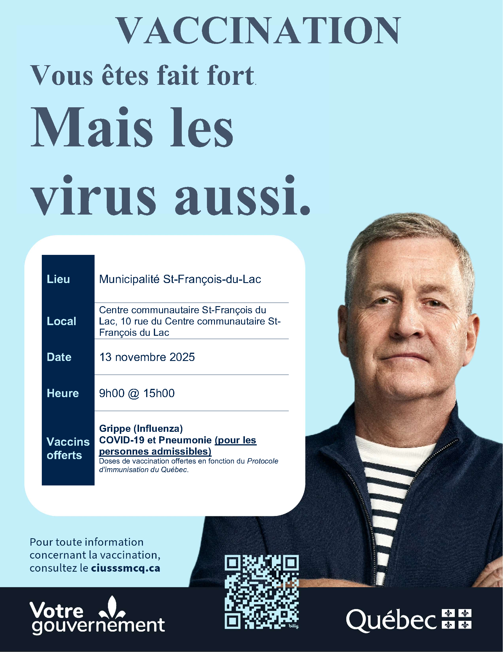 Une clinique de vaccination aura lieu le 13 novembre prochain, au Centre communautaire de Saint-François-du-Lac, de 9h à 15h.