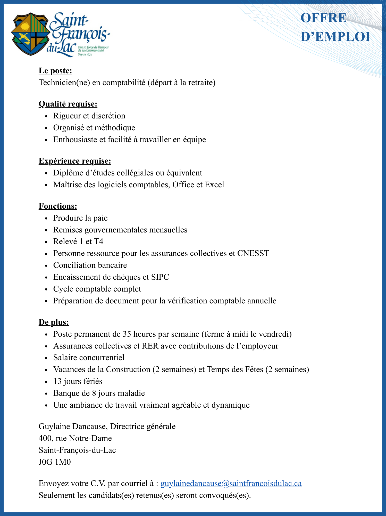 Faites parvenir votre C.V. par courriel au guylainedancause@saintfrancoisdulac.ca