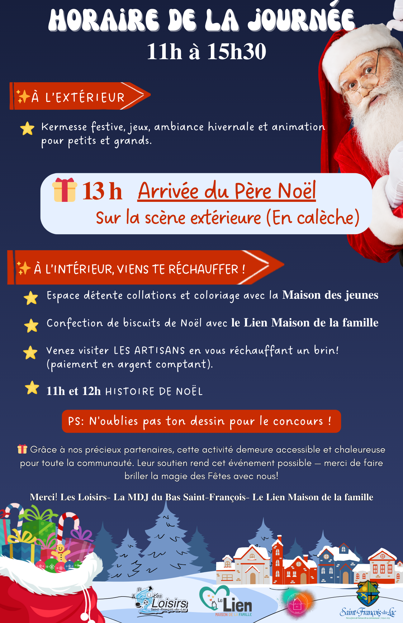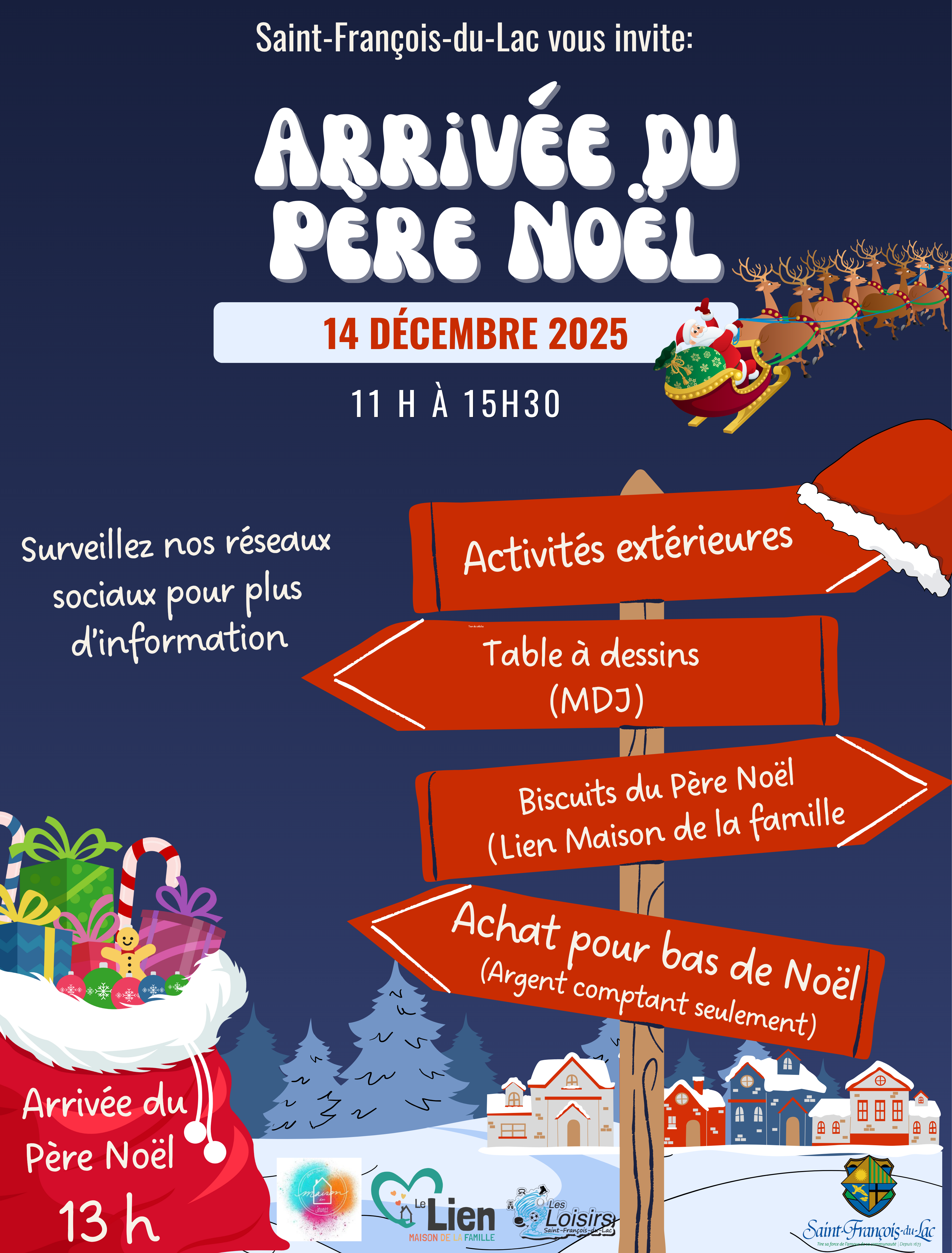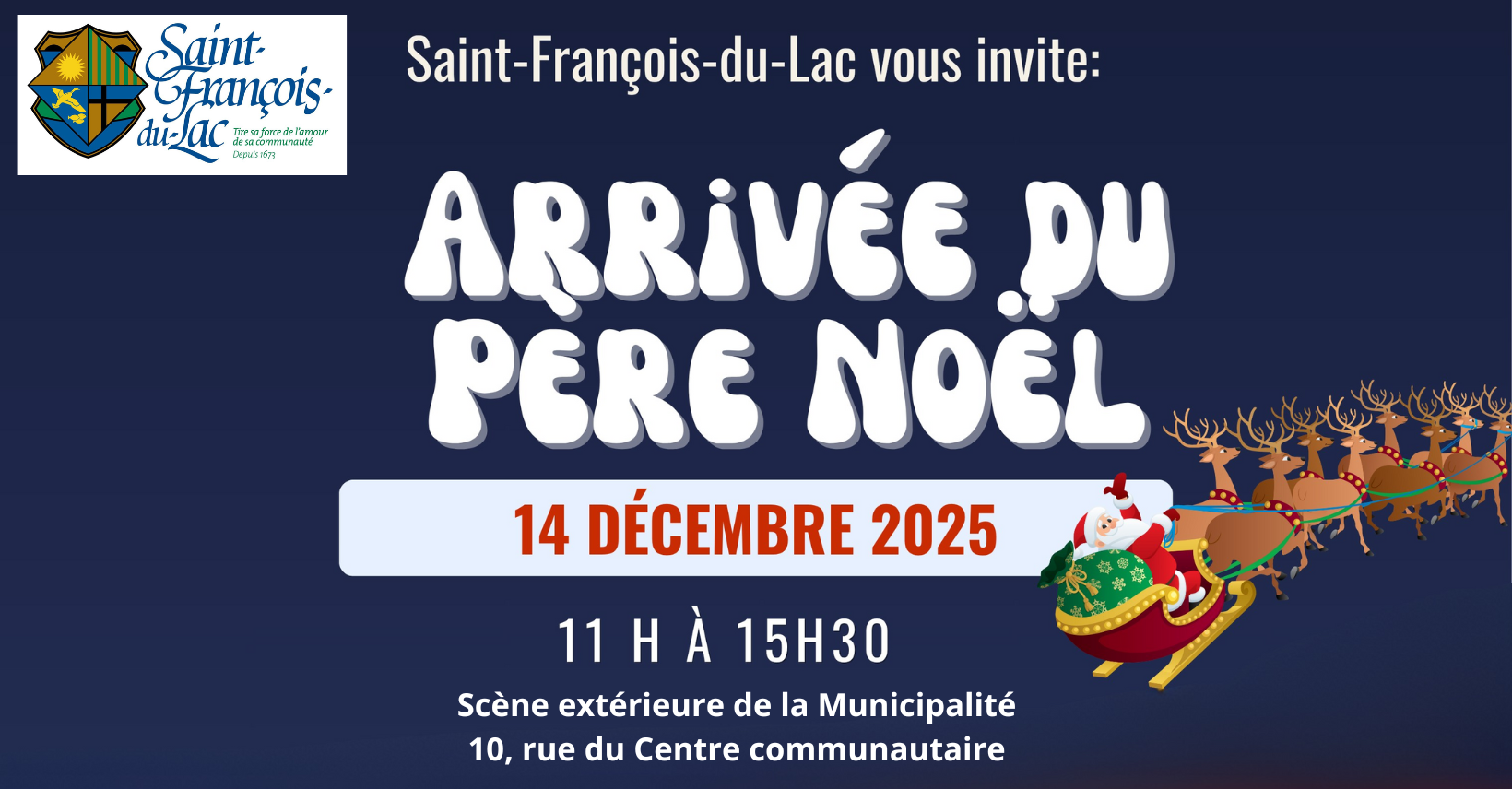 Ne manquez pas l'arrivée du Père Noël, le dimanche 14 décembre 2025, de 11h à 15h30, à la scène extérieure de la municipalité (10, rue du Centre communautaire, Saint-François-du-Lac).