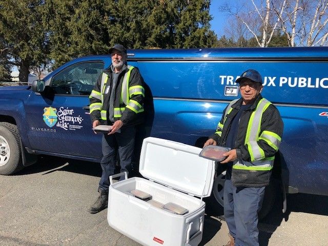 Première livraison de la popotte roulante par nos employés municipaux Denis et Paul.