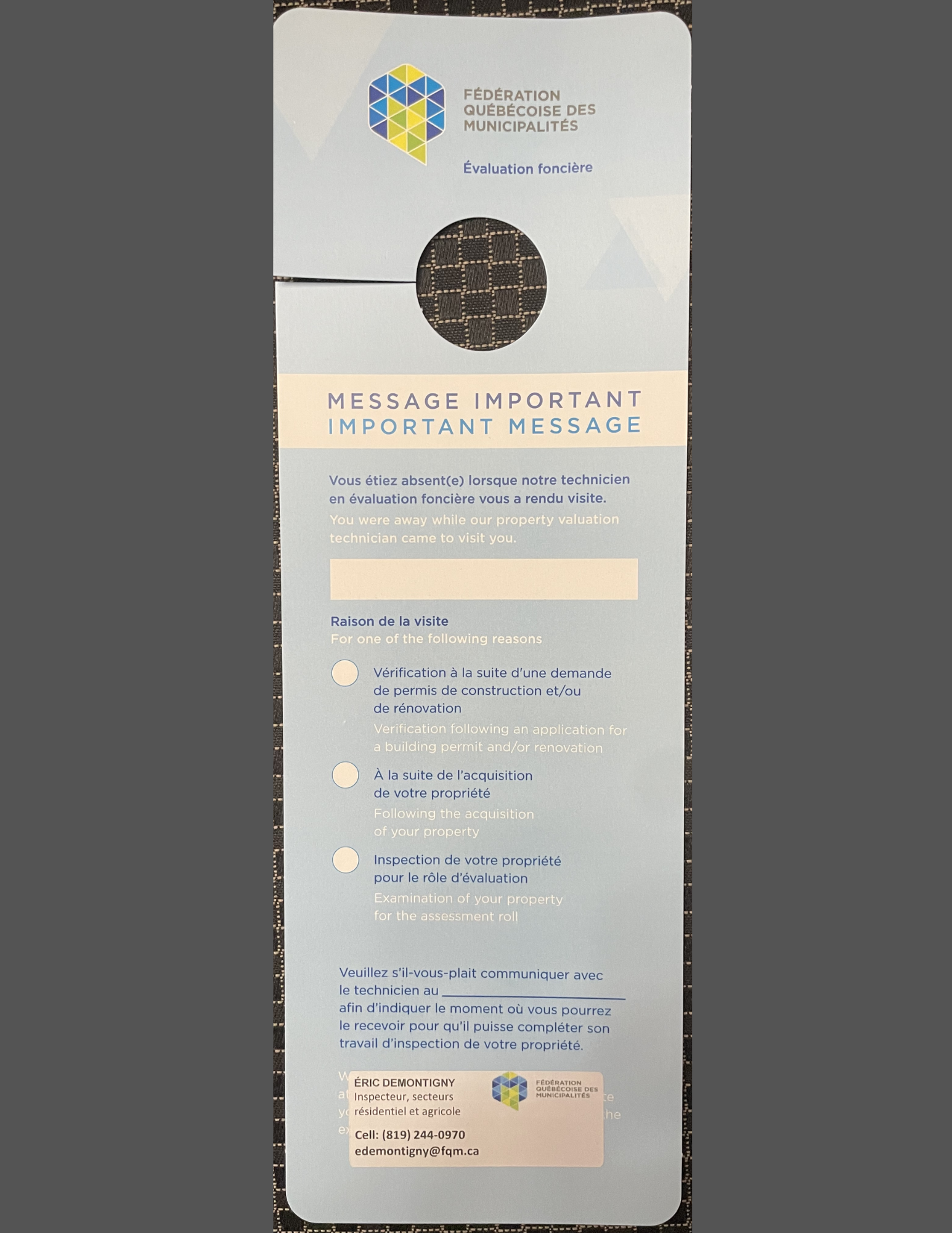 Présentement, un technicien en évaluation foncière envoyé par la FQM procède à la visite de certaines propriétés à Saint-François-du-Lac. Sachez que l'évaluateur, ou son représentant, a le pouvoir, en vertu de la loi sur la fiscalité municipale, de visiter votre propriété.