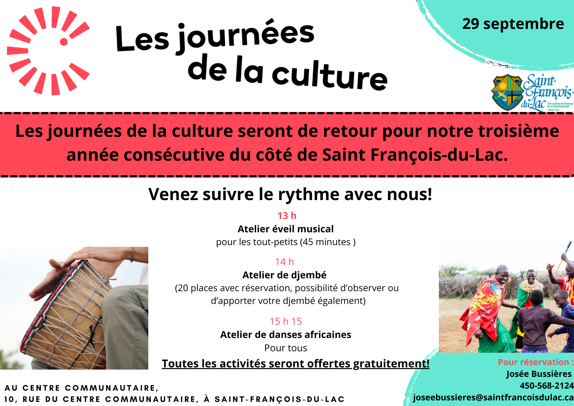 Dans le cadre des journées de la culture, le 29 septembre, la Municipalité est fière de vous présenter gratuitement 3 ateliers sur la culture africaine.