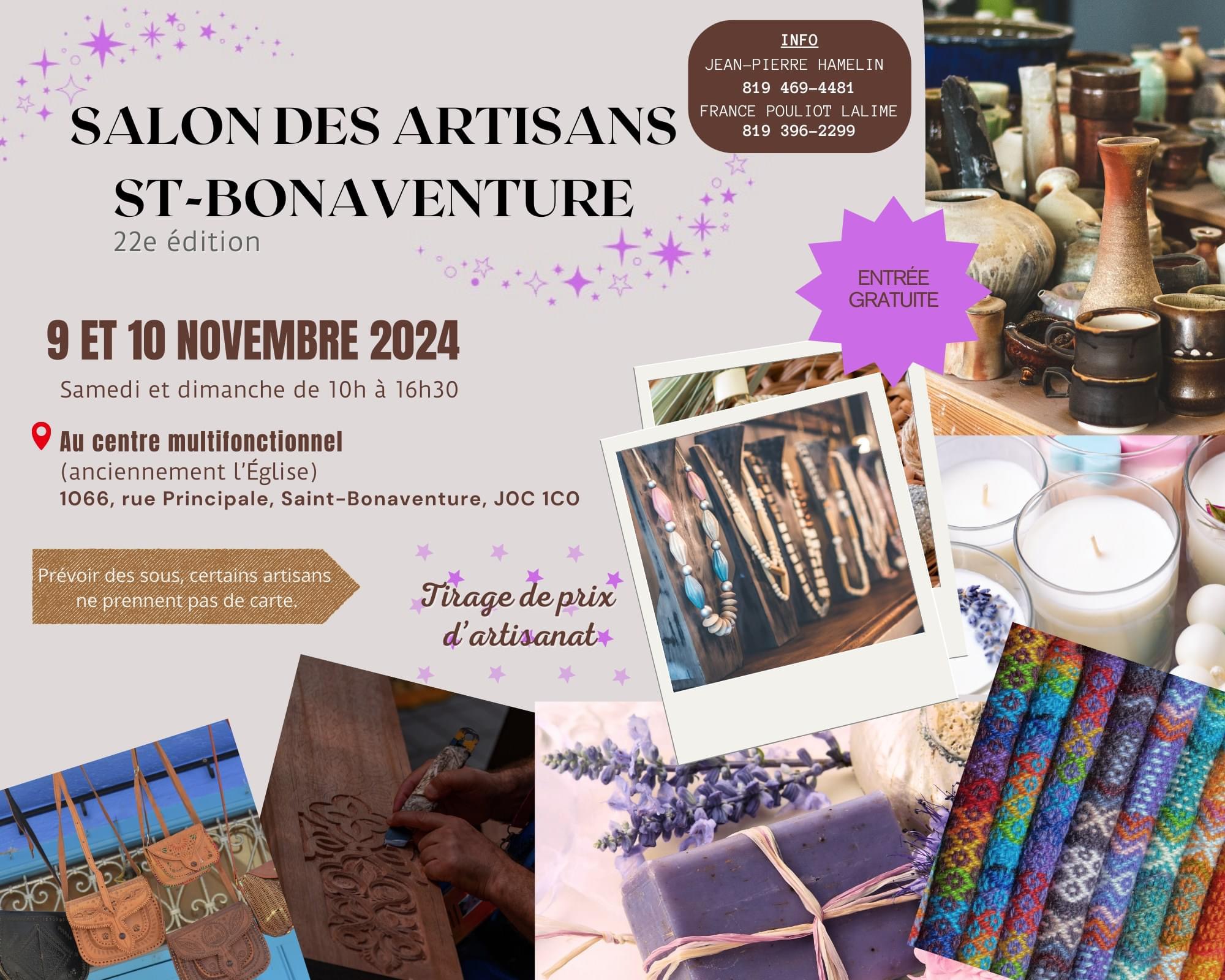 Les samedis et dimanches, 9 et 10 novembre 2024, de 10h à 16h30, aura lieu la 22e édition du Salon des artisans de Saint-Bonaventure.