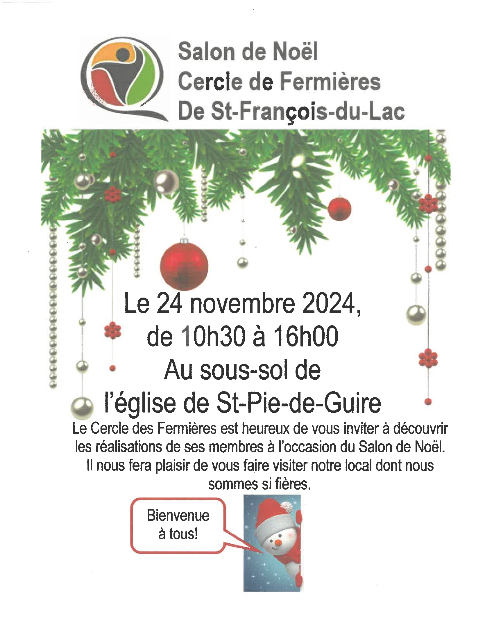 Le dimanche, 24 novembre, de 10h30 à 16h00, venez visitez le Salon de Noël du Cercle des Fermières de Saint-François-du-Lac, au sous-sol de l'église de Saint-Pie-de-Guire.