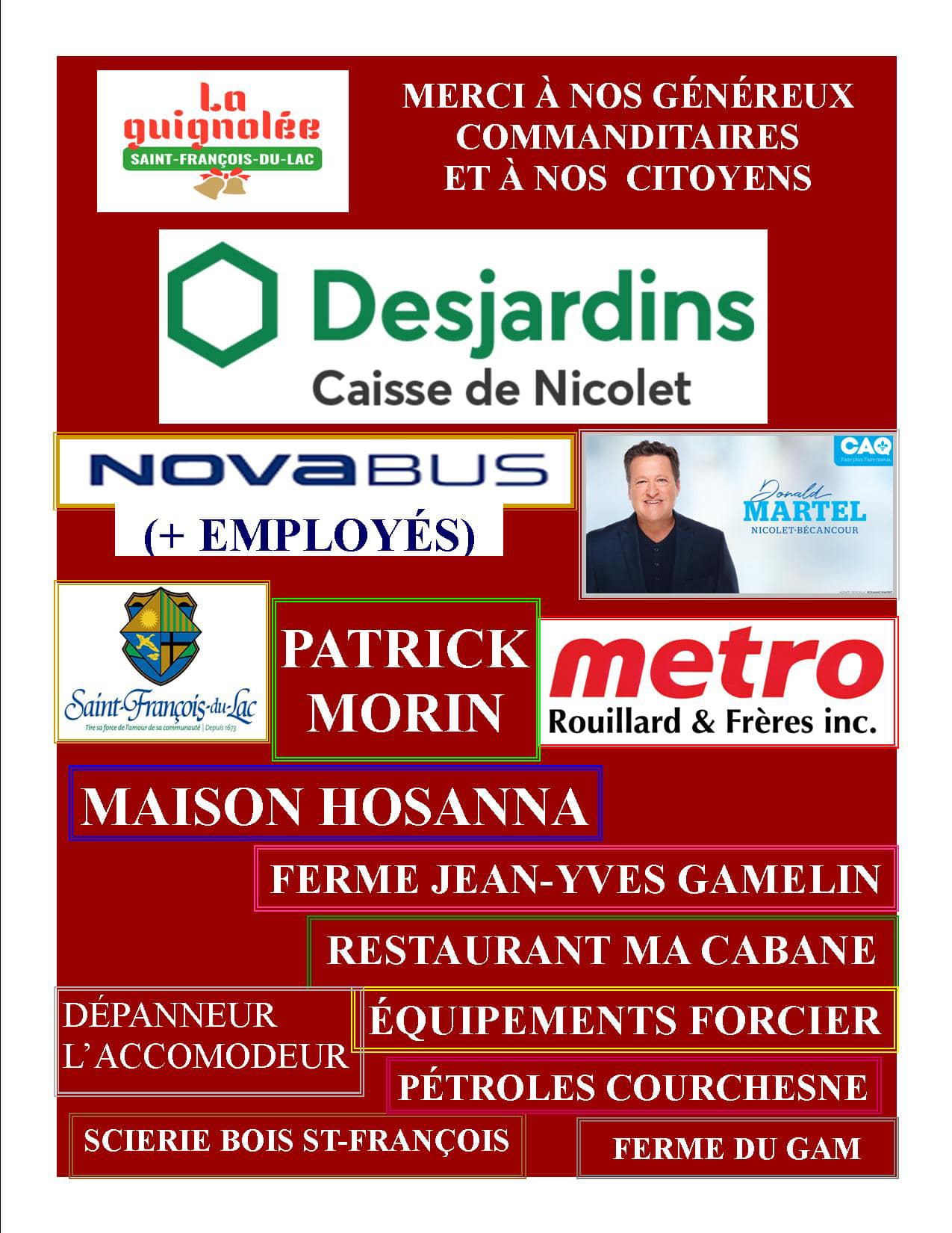 Caisse populaire Desjardins Donald Martel, député de Nicolet-Bécancour à l'Assemblée nationale Nova Bus Municipalité SaintFrançois-du-Lac Patrick Morin Marché Metro Rouillard et frères Maison Hosanna Ferme Jean-Yves Gamelin Restaurant MA Cabane @depanneur l'accomodeur @equipement Forcier Les Pétroles AA Courchesne Scierie Bois St-François inc. @ferme Du Gam