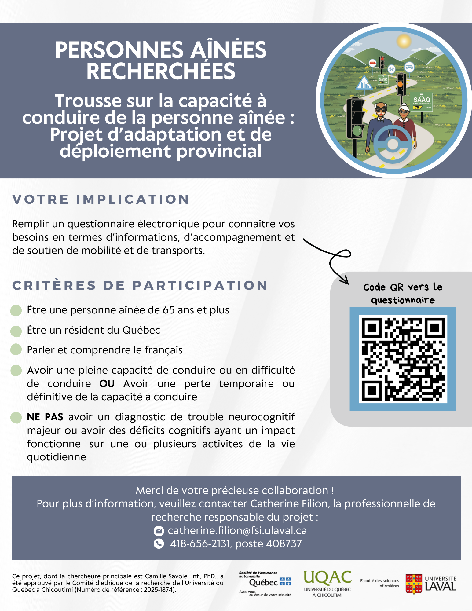 Nous sollicitons votre participation à remplir un questionnaire électronique dans le cadre d'un projet de recherche effectué par Martin Lavallière, professeur agrégé au Département des sciences de la santé à l'Université du Québec à Chicoutimi et Camille Savoie, professeure à la Faculté des sciences infirmières de l'Université Laval, en partenariat avec la Société de l'assurance automobile du Québec (SAAQ). Cette recherche est financée par la SAAQ.