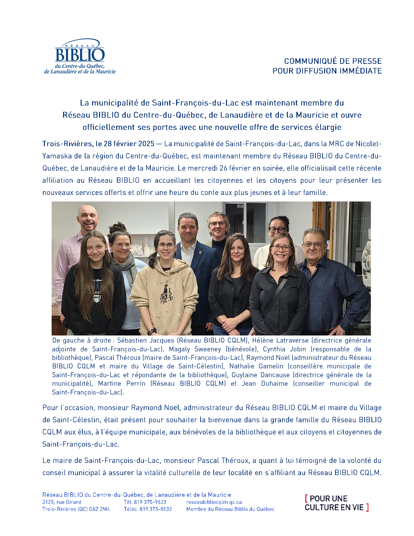 Veuillez prendre connaissance du communiqué de presse suivant du Réseau Biblio, suite à l'inauguration du service avec la Municipalité de Saint-François-du-Lac qui a eu lieu le mercredi 26 février 2025.