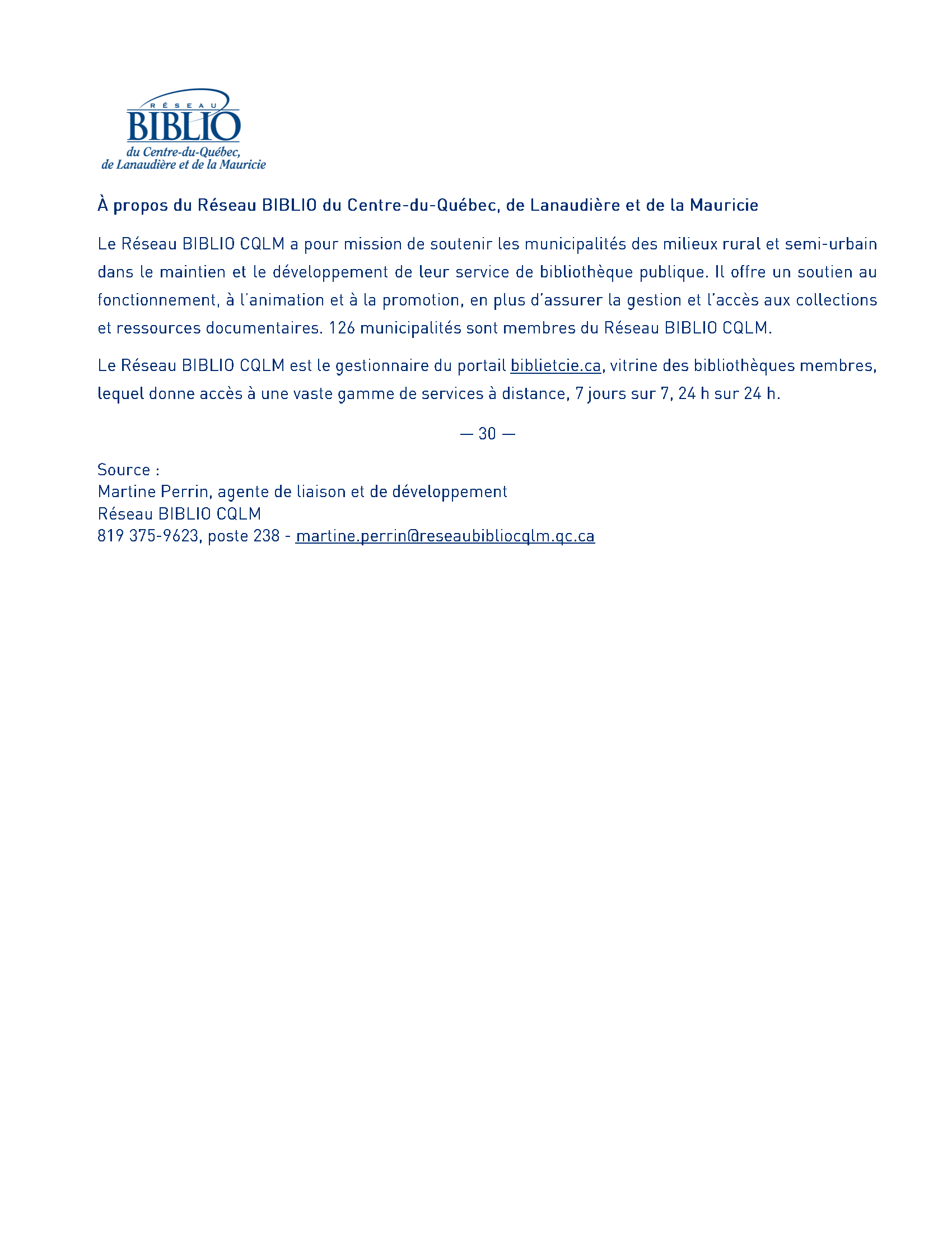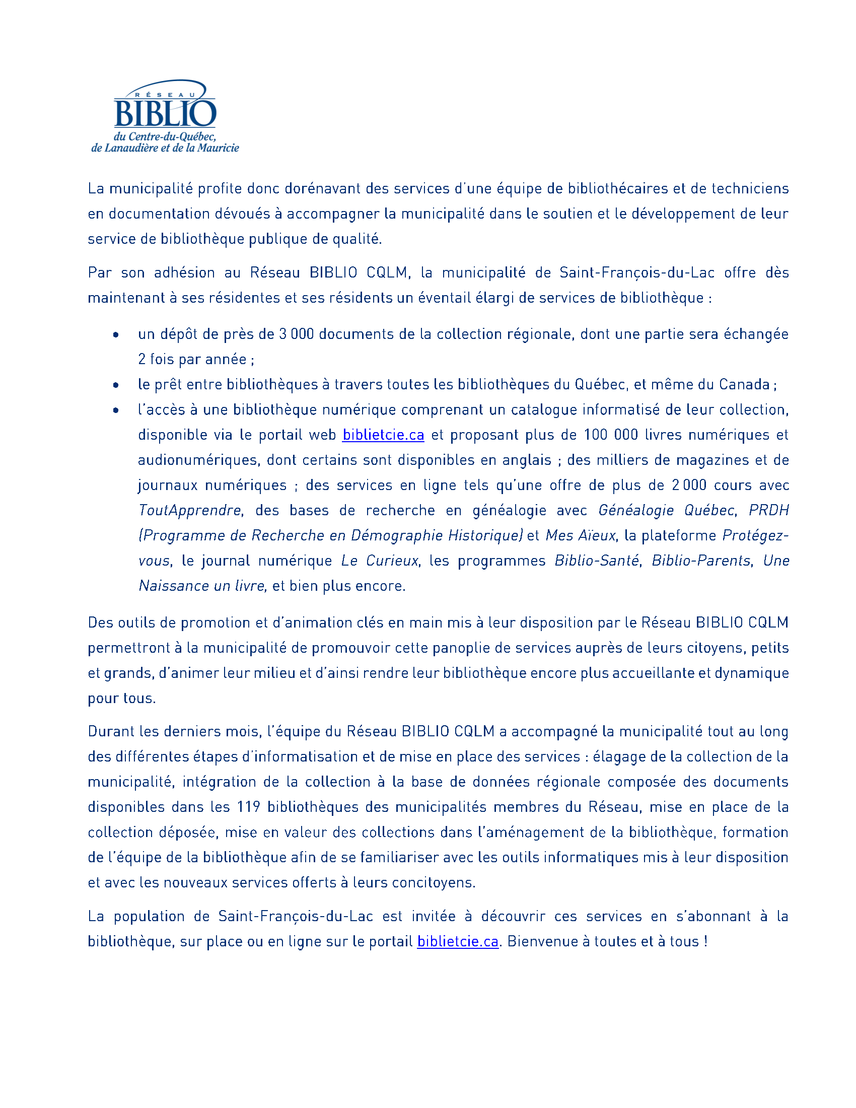 La Municipalité de Saint-François-du-Lac est maintenant membre du Réseau BIBLIO - Communiqué de presse