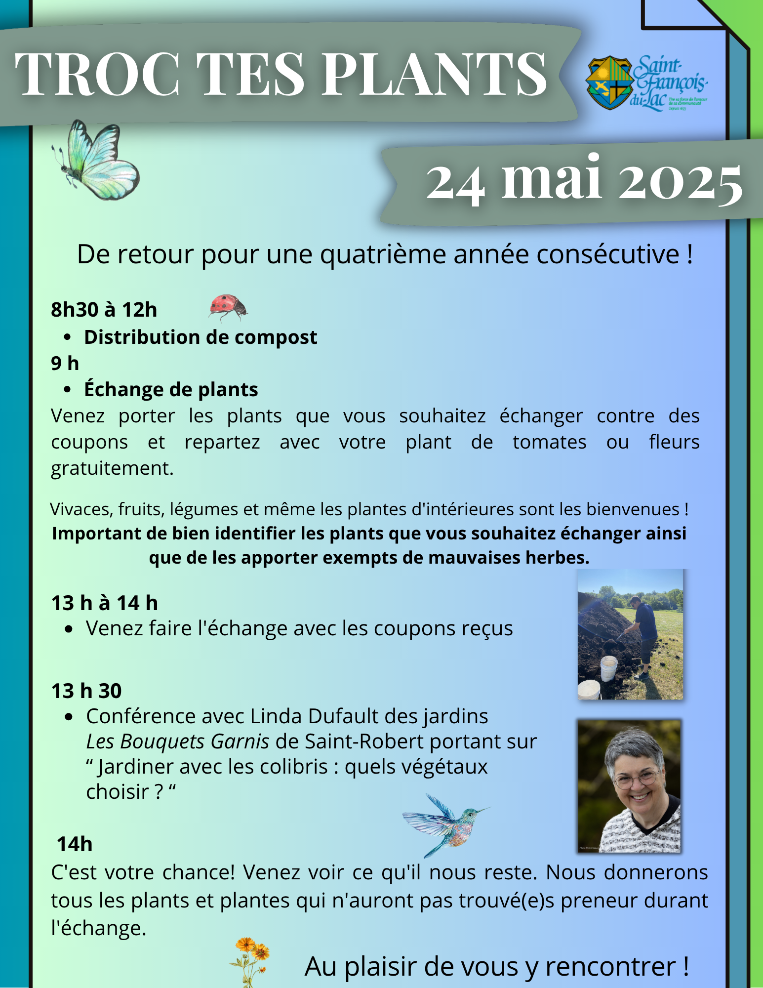 Le 24 mai, ce sera le moment pour venir chercher votre compost, échanger vos plants et assister à une conférence sur la façon de jardiner avec les colibris.