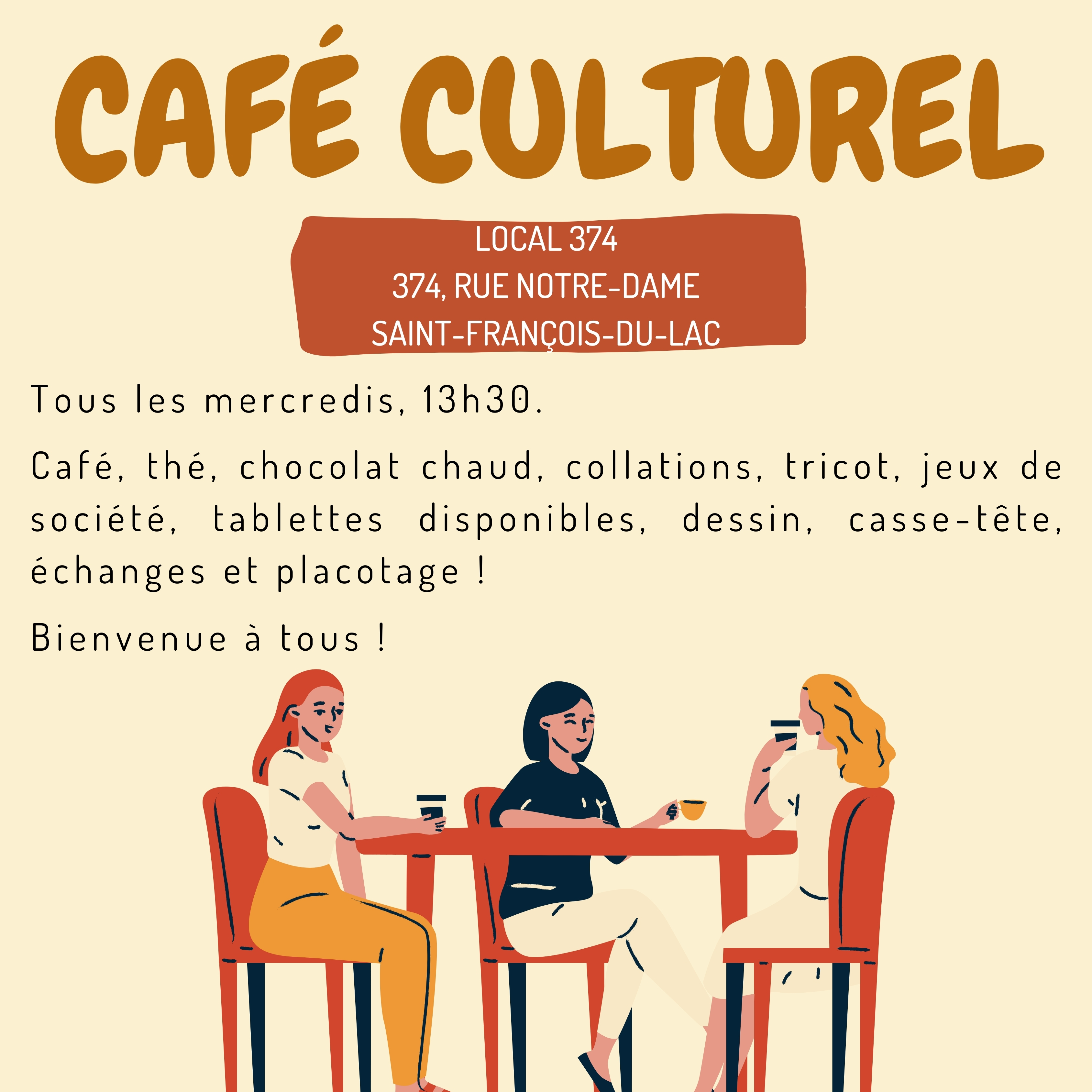 Nous vous invitons à venir jouer à nos jeux de société, utiliser les tablettes avec internet, tricoter, dessiner, mais surtout placotter autour d'un bon café.