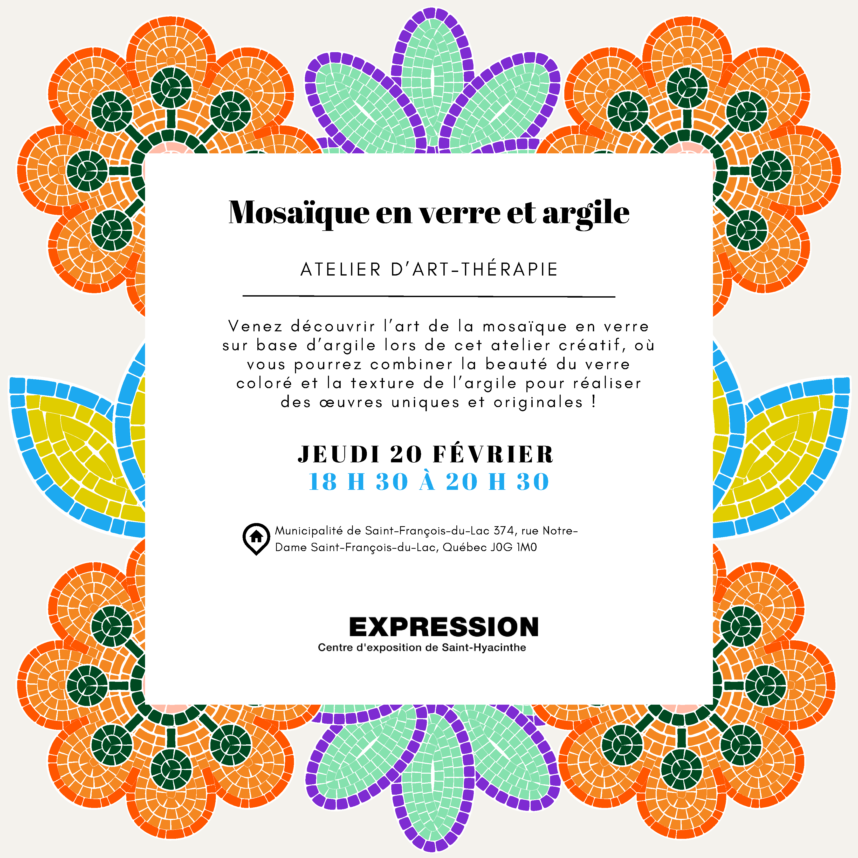 Venez découvrir l'art de la mosaïque en verre sur une base d'argile lors de cet atelier créatif, où vous pourrez combiner la beauté du verre coloré et la texture de l'argile pour réaliser des ?uvres uniques et originales!